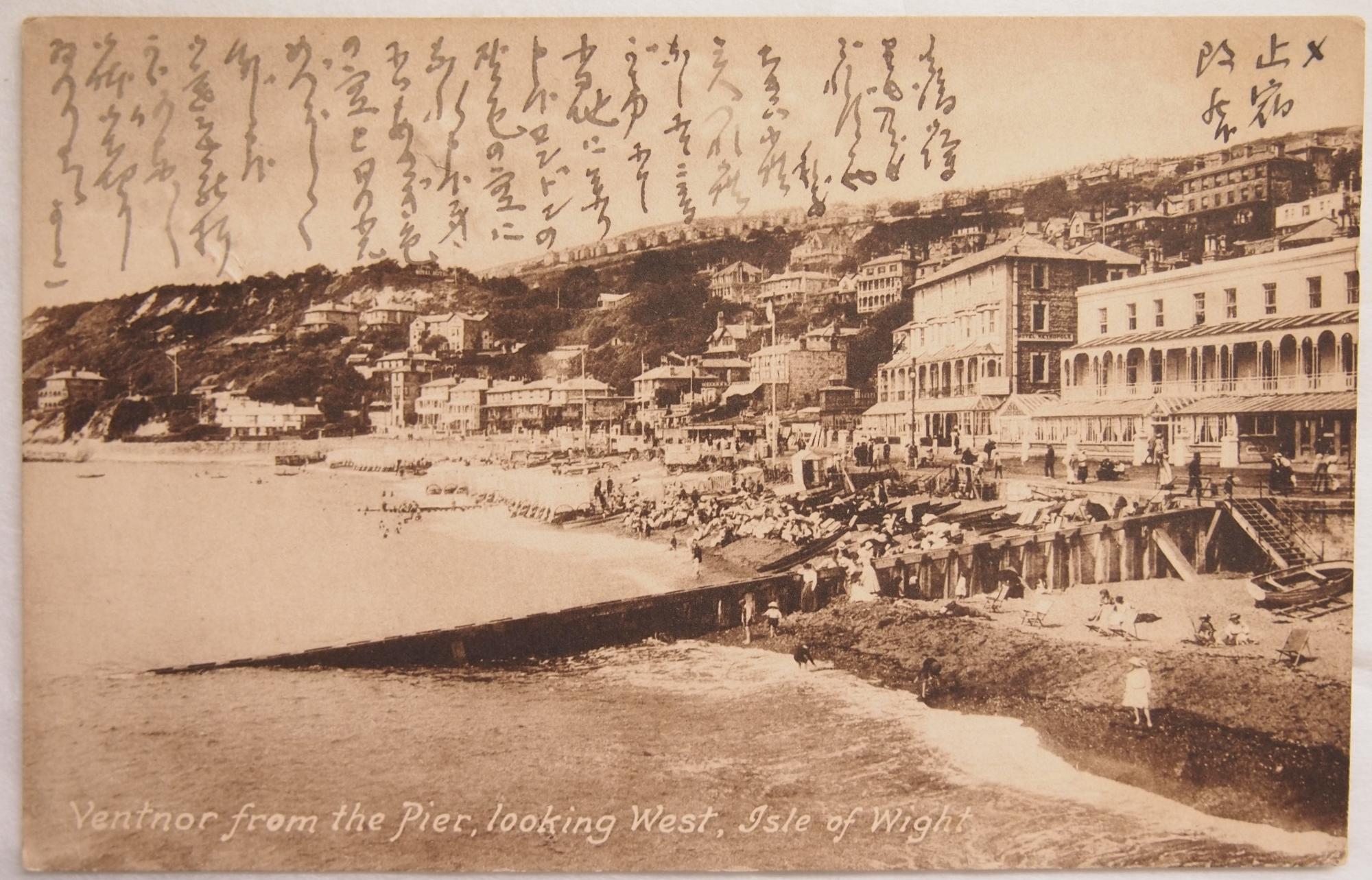 吉田茂は、大正9年(1920)より英国大使館の一等書記官としてイギリスに赴任していました。手紙が書かれたのも、消印に「24. DE. 20」とあることから赴任した年のクリスマス・イブであることがわかります。クリスマス・ホリディを吉田は家族とイングランド南部のワイト島にある海辺の保養地・ベントナーで過ごしました。