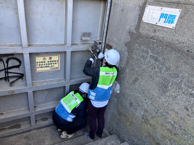 発災後に情報収集を行い、港内放送及びフラッグを掲出し、大磯港来場者の避難誘導を行うとともに防潮門扉を閉鎖する訓練を実施しました。