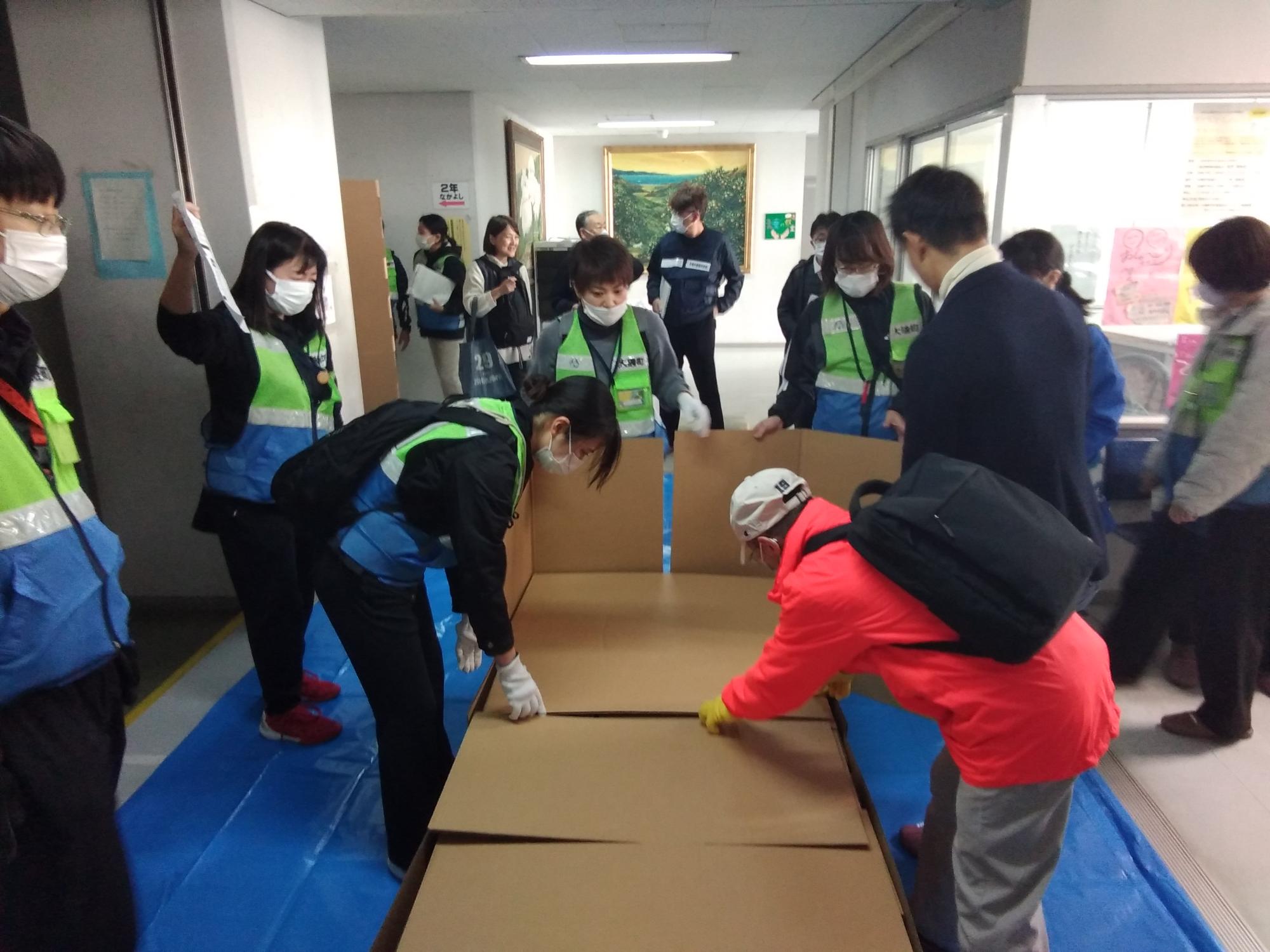 パーティションを組立てる様子(国府中学校)
