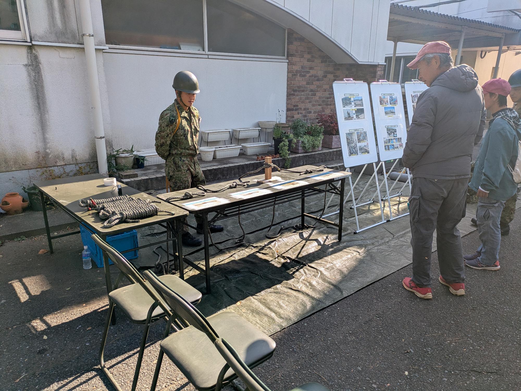 自衛隊のロープワーク、パネル、人命救助セットを展示する様子