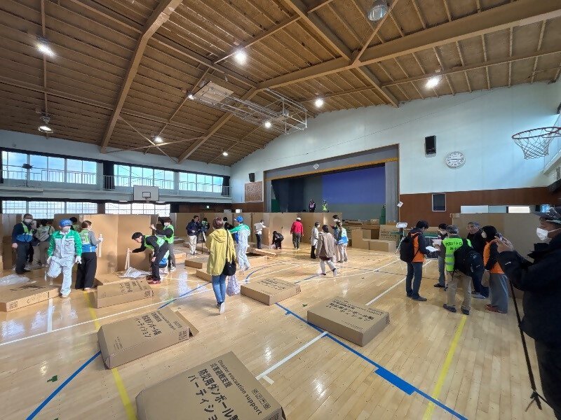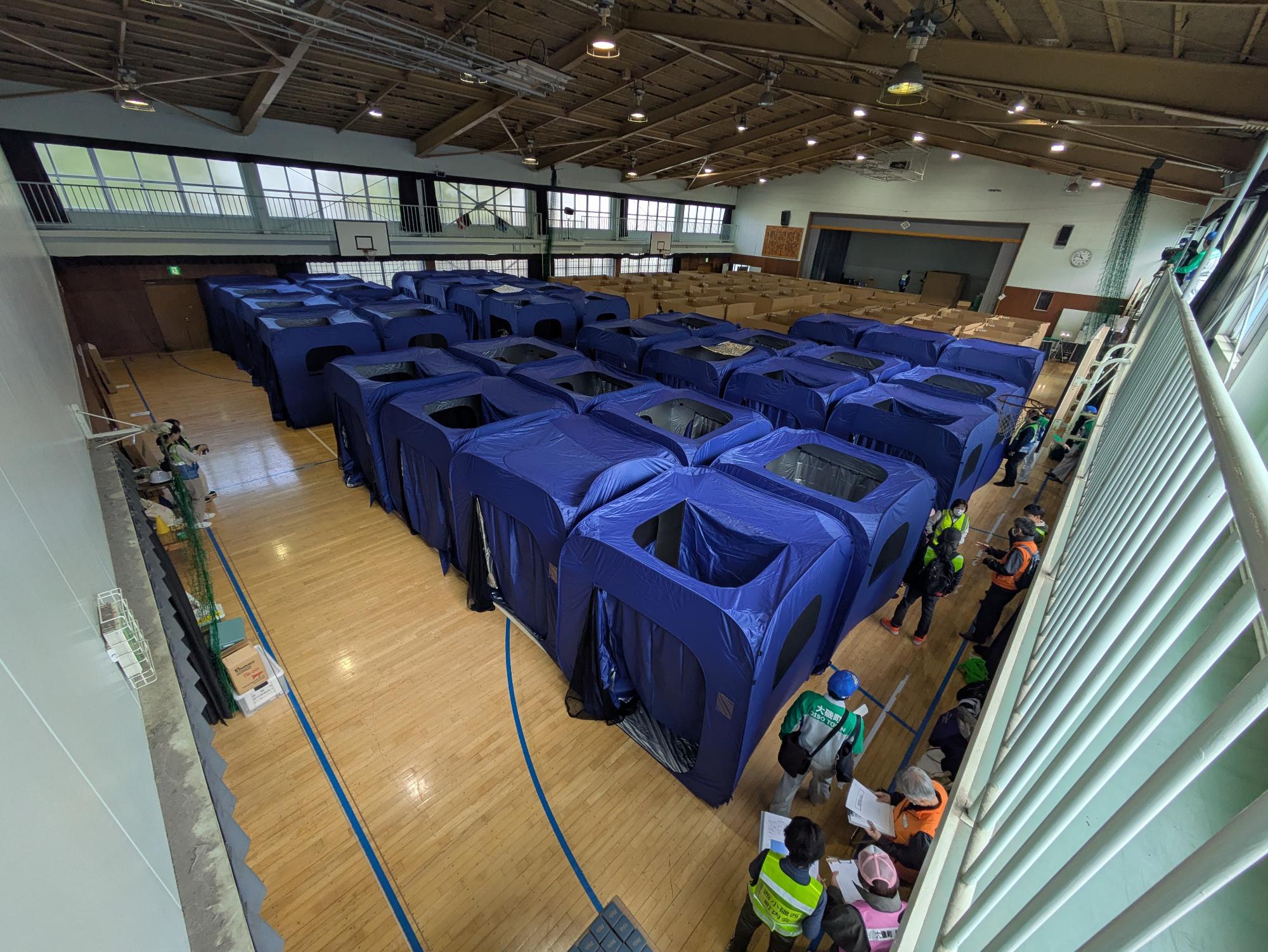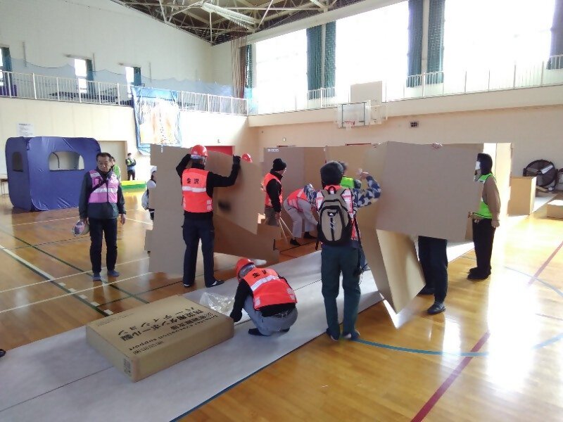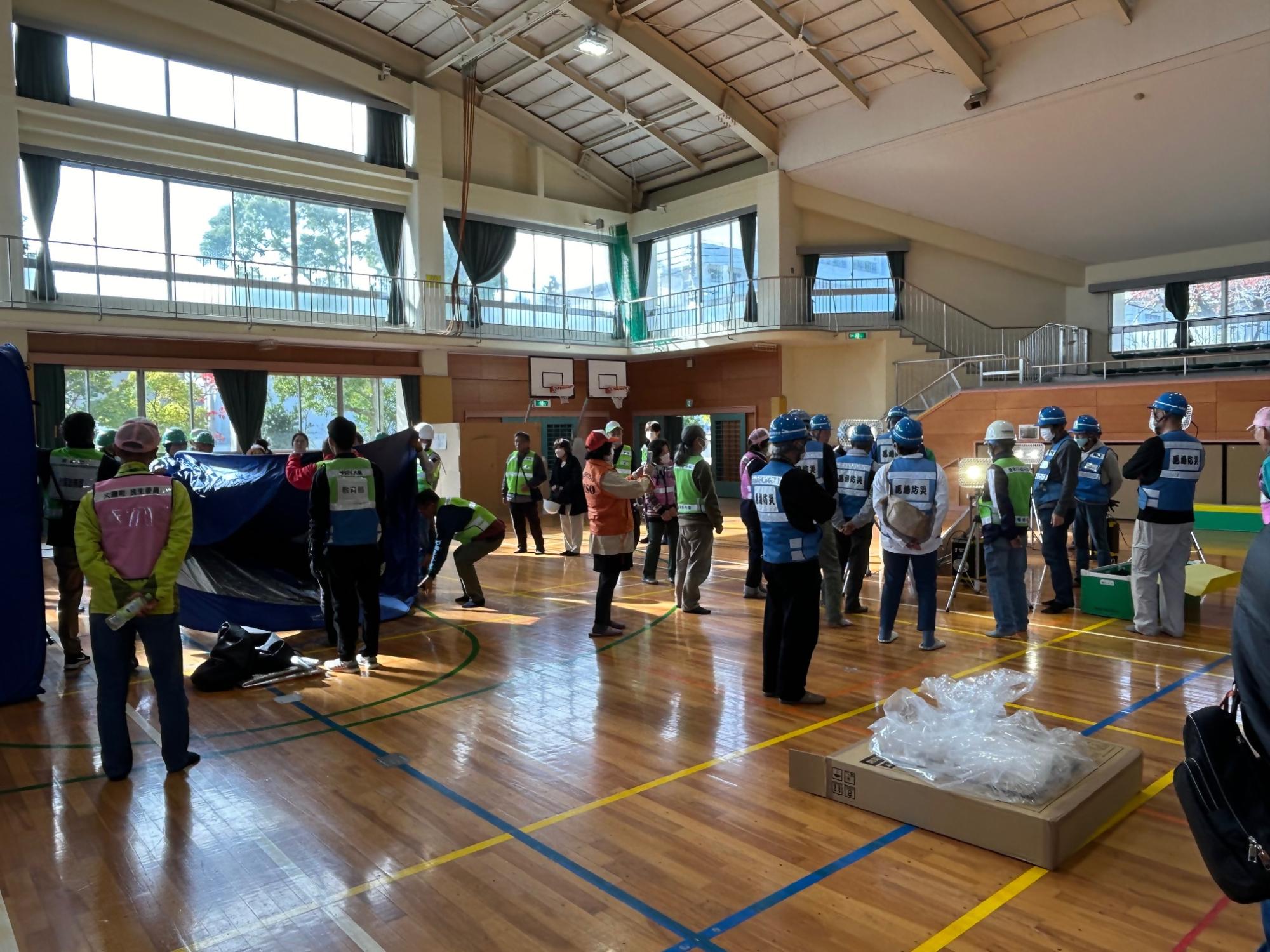 大津波警報解除後、各指定避難所には町民の皆さんが集まり、開設及び運営までの一連の行動を確認しました。訓練では、町職員とともに町民の皆さんが主体となり避難所のレイアウト作成及び資機材の組立てを行い、避難所開設に関する知識の習得や理解の向上につながりました。