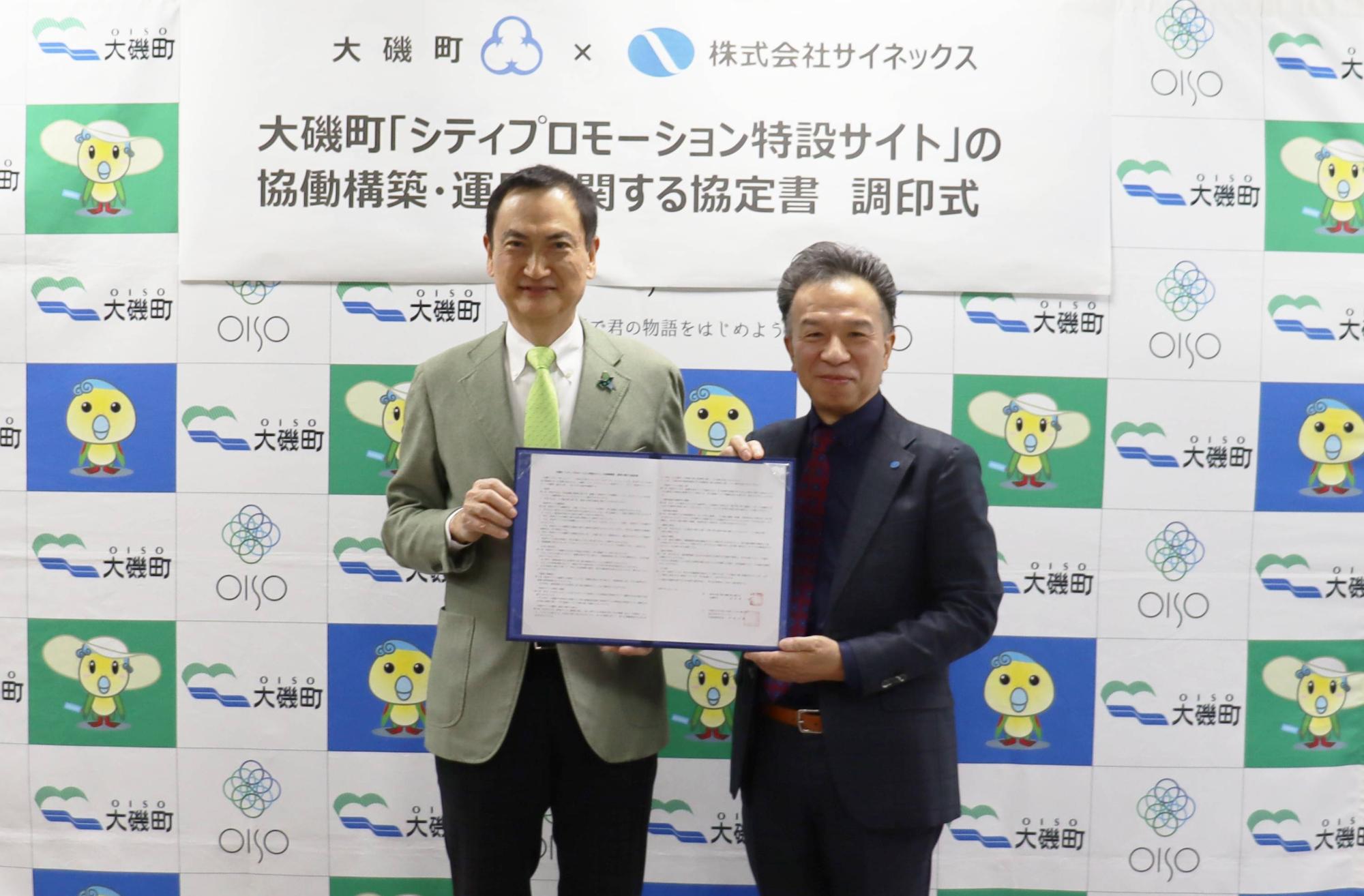 本町と株式会社サイネックスは、令和8年3月13日に官民連携事業による「シティプロモーション特設サイト」の協働構築および運用に関して、協定書の調印式を行いました。